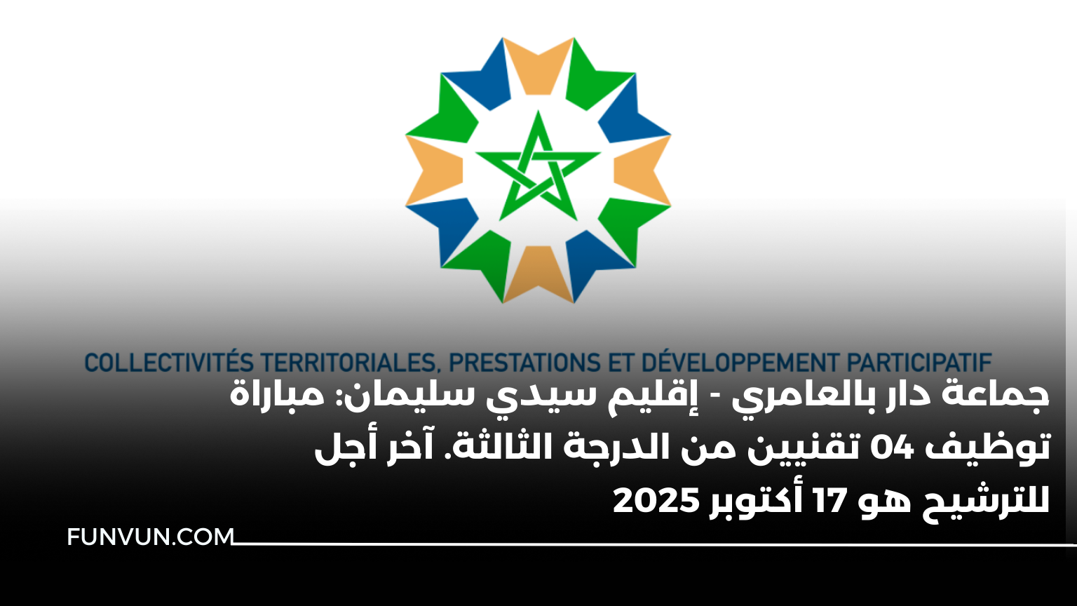 جماعة دار بالعامري – إقليم سيدي سليمان: مباراة توظيف 04 تقنيين من الدرجة الثالثة. آخر أجل للترشيح هو 17 أكتوبر 2025