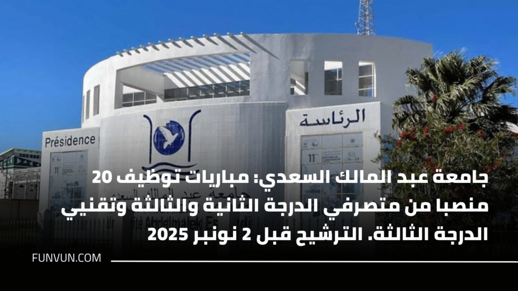 تعلن جامعة عبد المالك السعدي عن تنظيم مباريات للتوظيف في المناصب العمومية يوم 9 نونبر 2025، وتشمل (11) متصرفاً من الدرجة الثانية، (5) متصرفين من الدرجة الثالثة، و(4) تقنيين من الدرجة الثالثة، وذلك وفق التفاصيل التالية: