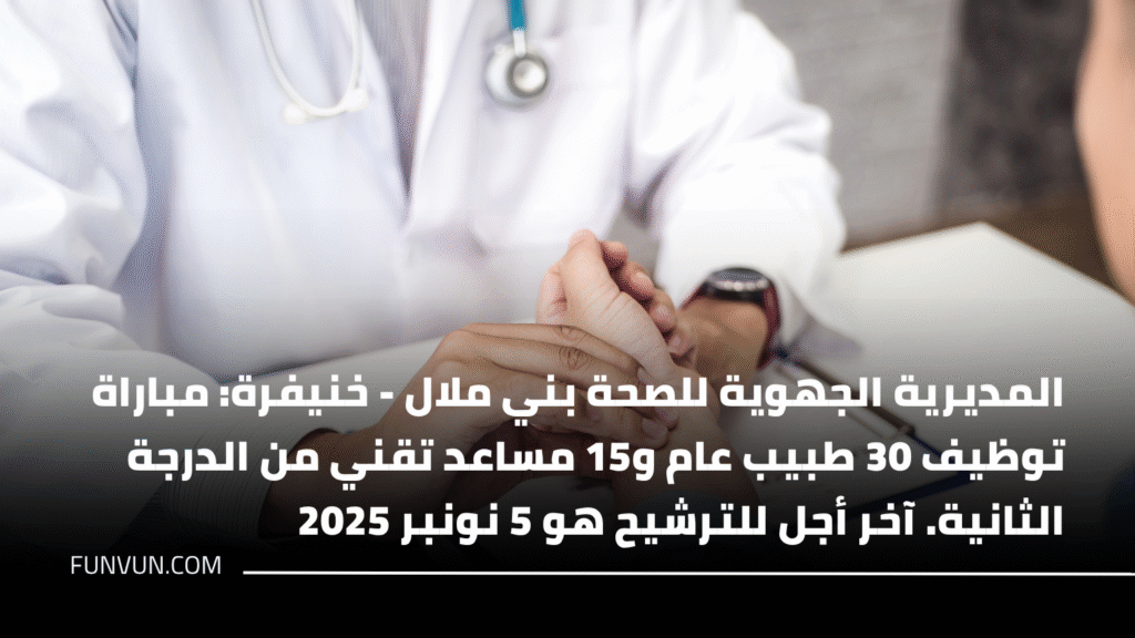 تعلن وزارة الصحة والحماية الاجتماعية، عن طريق المديرية الجهوية بجهة بني ملال خنيفرة، عن تنظيم مباراة لتوظيف أطباء عامين من الدرجة الأولى ومساعدين تقنيين من الدرجة الثانية، وذلك يوم الأحد 16 نونبر 2025 على الساعة التاسعة صباحًا بمدينة بني ملال.