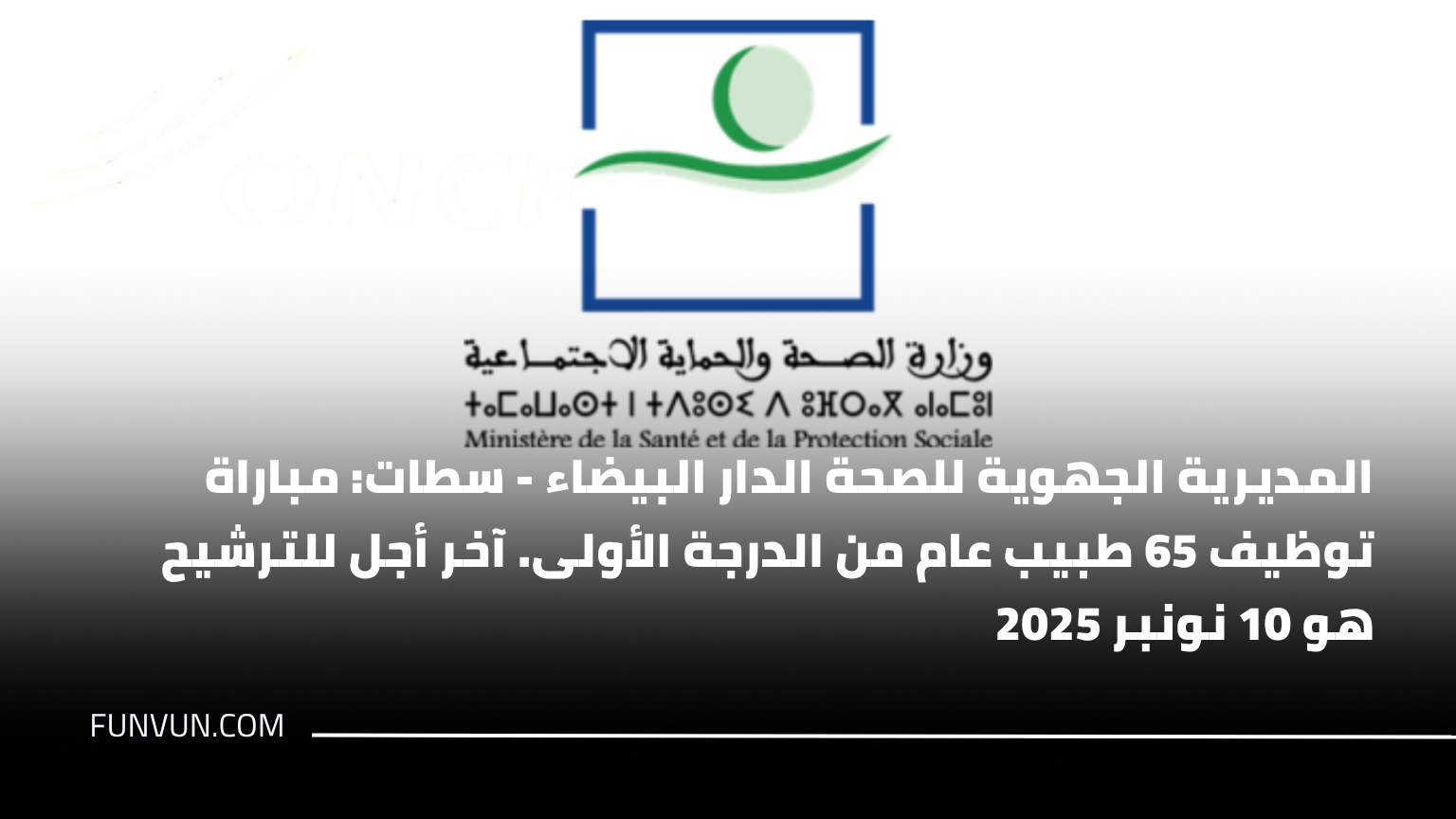 تعلن وزارة الصحة والحماية الاجتماعية عن تنظيم مباراة لتوظيف أطباء عامين من الدرجة الأولى، وذلك يوم الأحد 16 نونبر 2025 على الساعة التاسعة صباحًا بمدينة الدار البيضاء.
