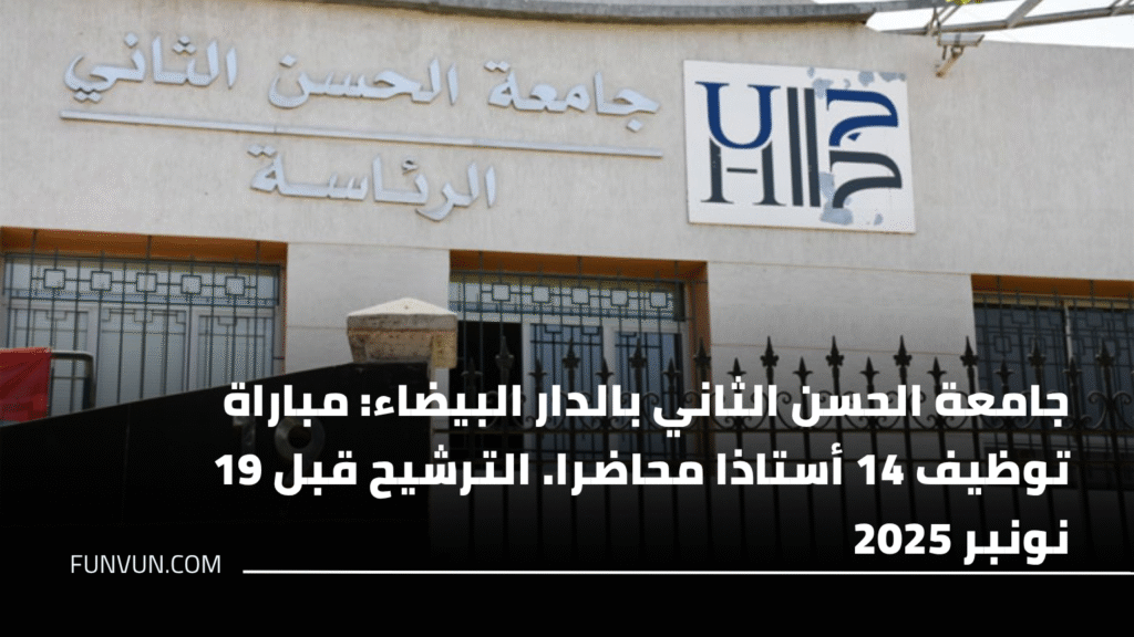 تعلن جامعة الحسن الثاني بالدار البيضاء عن فتح مباريات لتوظيف أربعة عشر (14) أستاذا محاضرا لفائدة مؤسساتها الجامعية، وذلك في إطار دورة 24 نونبر 2025.